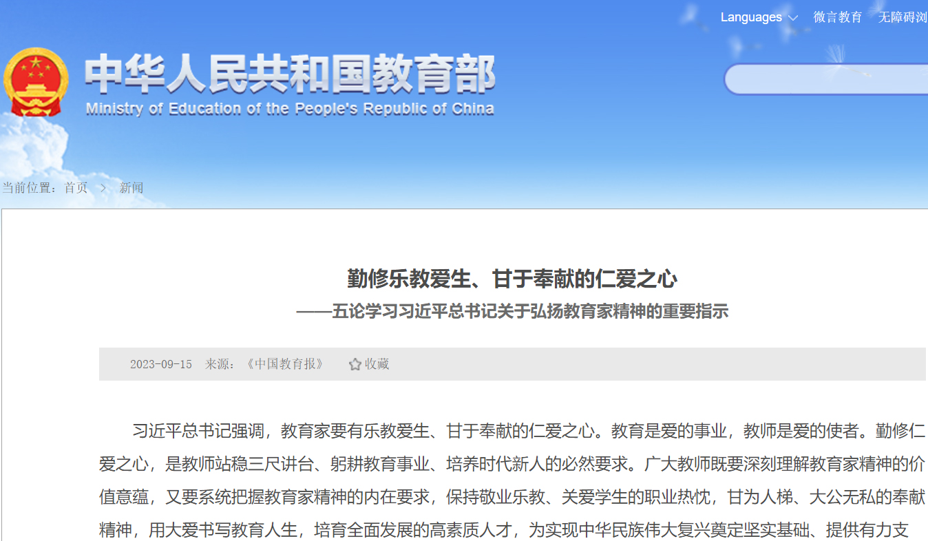 • 在第三十九个教师节到来之际,全国优秀教师代表座谈会在京召开。习近平总书记致信与会教师代表,站在实现中华民族伟大复兴中国梦,打造中华民族“梦之队”筑梦人的高度,从理想信念、道德情操、育人智慧、躬耕态度、仁爱之心、弘道追求六方面全面完整地阐述了中国特有的教育家精神的核心要义,勉励广大教师大力弘扬教育家精神,为强国建设、民族复兴伟业作出新的更大贡献。