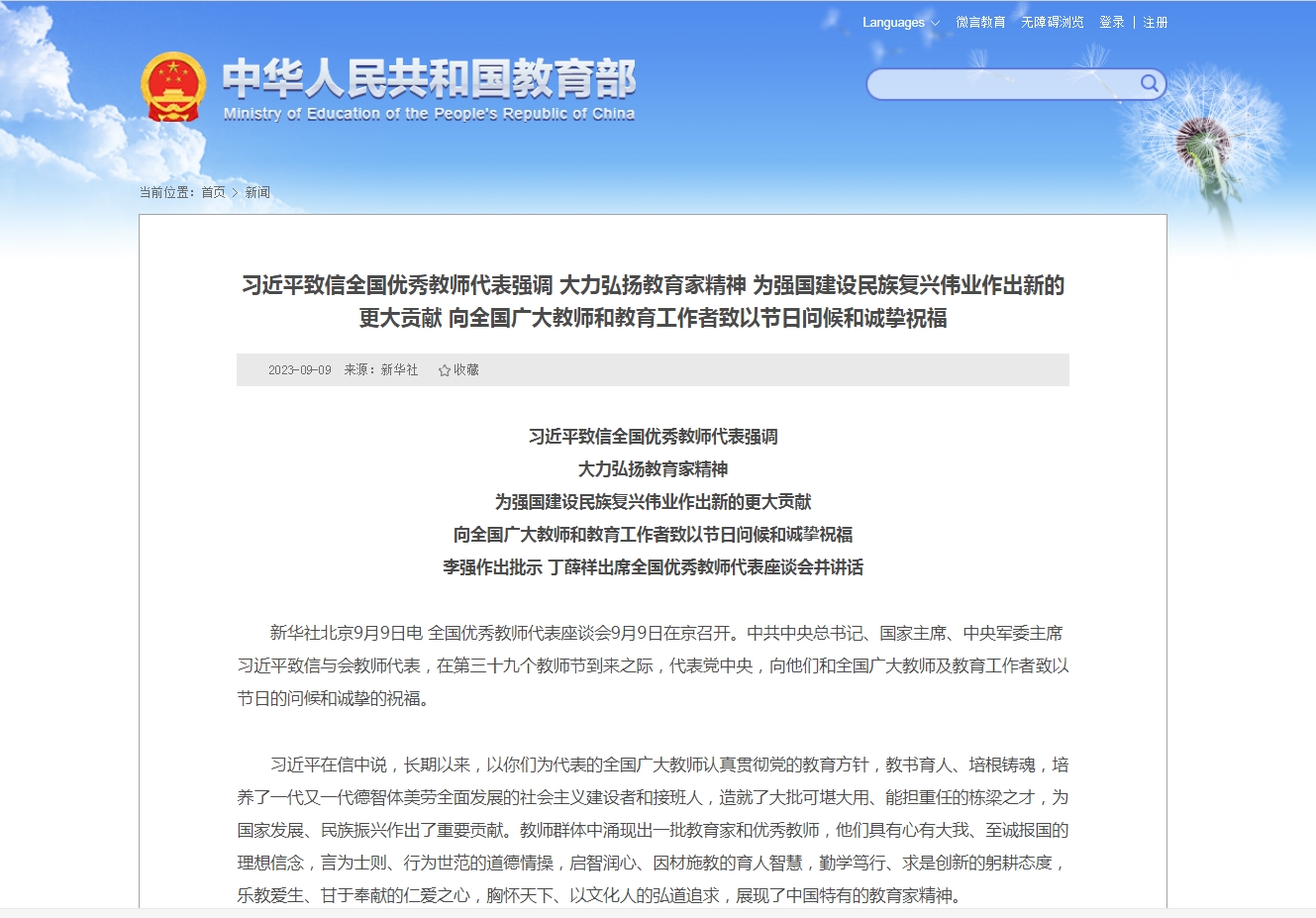 • 新华社北京9月9日电:全国优秀教师代表座谈会9月9日在京召开。中共中央总书记、国家主席、中央军委主席习近平致信与会教师代表,在第三十九个教师节到来之际,代表党中央,向他们和全国广大教师及教育工作者致以节日的问候和诚挚的祝福。